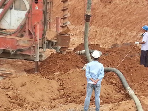 由于連續(xù)的雷雨天氣,場地泥濘不堪,施工人員根本無法進入場地,導致焦炭塔和壓縮機廠房CFG樁基礎的開挖和打樁進度滯后。期間又值東鑫垣整個廠區(qū)停電,打樁機維修,供電電壓不足,電纜線負荷不夠,地泵故障等等一系列突發(fā)情況。2013年8月4日下午,上海勝幫東鑫垣項目部人員帶領陜西建工機械公司披荊斬棘,排除萬難,終于在13點34分時成功打下第一根CFG樁,經(jīng)現(xiàn)場測量符合施工標高…
