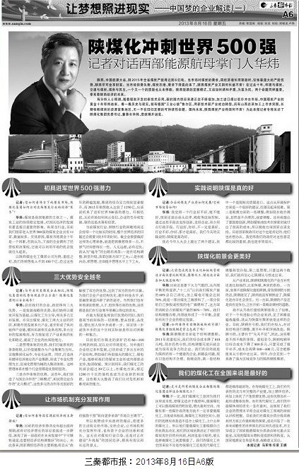 陜煤化沖刺世界500強記者對話西部能源航母掌門人華煒陜西,中國能源大省,到2015年全省煤炭產(chǎn)能將達到6億噸。當(dāng)市場對煤炭的需求,因經(jīng)濟增長而強勁時,僅依靠龐大的產(chǎn)能優(yōu)勢,陜西盡可坐享財富。當(dāng)市場供需失衡,煤炭壓港、需求下滑真的來了,陜西煤炭產(chǎn)業(yè)又因何長盛不衰?在過去十年,環(huán)境與煤炭、交通與煤炭、煤炭與民生,一個又一個的質(zhì)疑也從未停歇。陜西能源的發(fā)展模式,又…