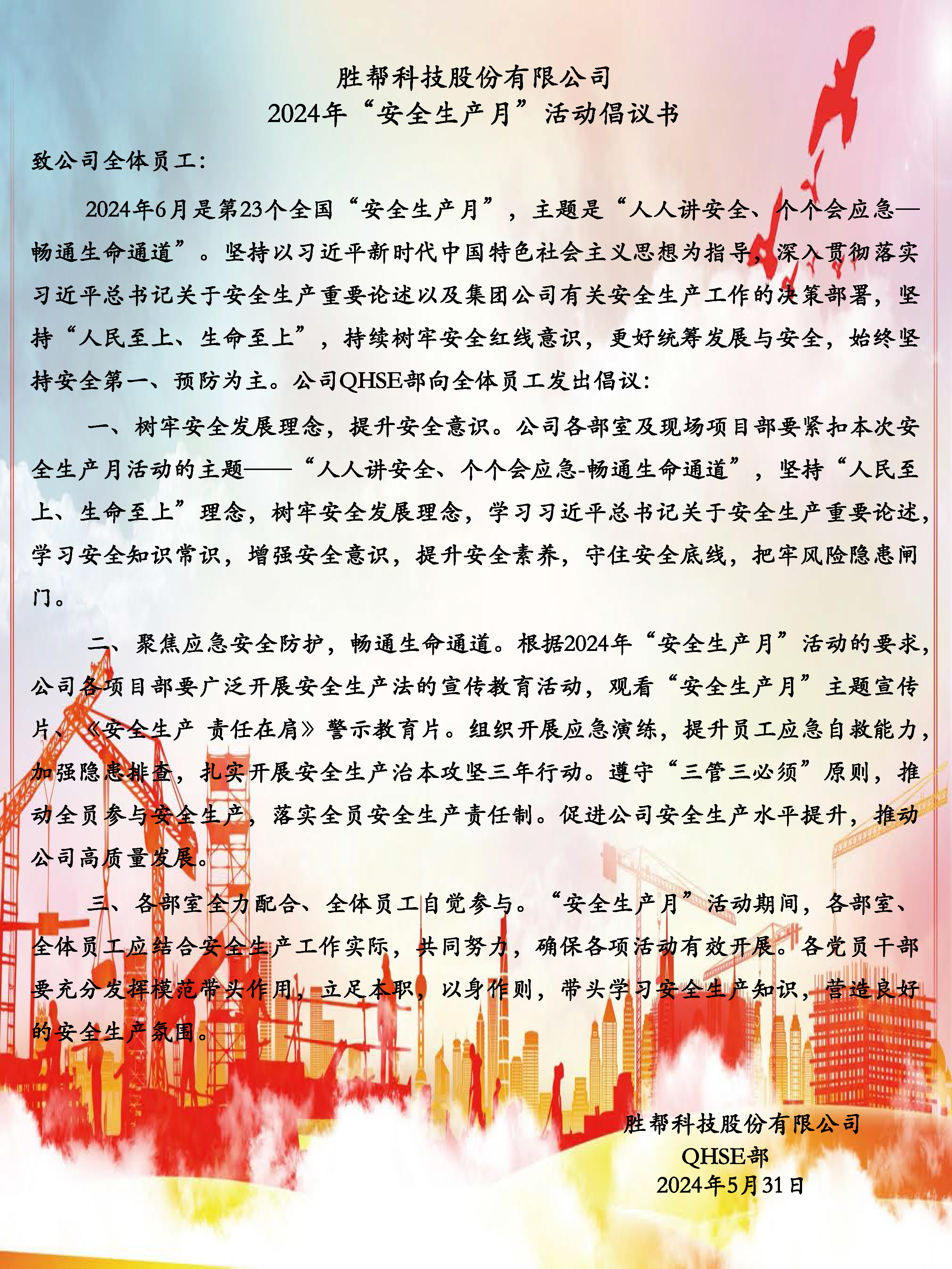 勝幫科技股份有限公司2024年“安全生產(chǎn)月”活動(dòng)倡議書