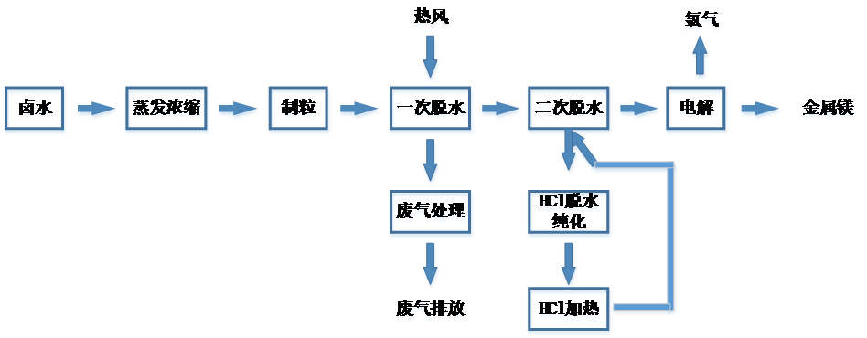 該法是將含33 %左右的MgCl2鹵水先凈化除雜,再蒸發(fā)濃縮噴灑造粒,制成含水約48 %的固體顆粒,將此顆粒送一次脫水沸騰床中用熱風(fēng)進(jìn)行脫水,得到含水約23 ~ 25 %的一次脫水顆粒。為抑制氯化鎂水解,再在二次脫水沸騰床中用熱HCl氣體進(jìn)行完全脫水,制得無(wú)水氯化鎂顆粒料,HCl尾氣在HCl處理系統(tǒng)中脫水純化后循環(huán)使用,無(wú)水氯化鎂顆粒料加入電解槽中,電解制得金屬鎂和氯氣,具體工藝見(jiàn)下圖。