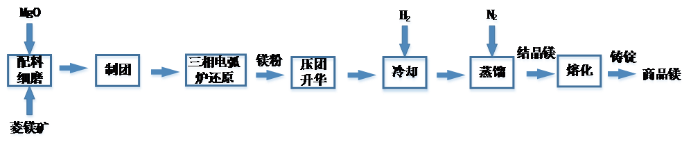 該法是以木炭、煤、焦炭等碳質(zhì)材料作還原劑,在高溫條件下從氧化鎂中還原制取金屬鎂的方法,其反應(yīng)方程式如下:MgO(s) + C(s) = Mg(g) + CO(g)。該法于1938年由奧地利F.Hansgirg提出,團(tuán)塊爐料在1800 ℃或更高溫度的三相電弧爐中進(jìn)行反應(yīng),還原出Mg蒸氣和CO氣體,再混入大量中性氣體(如氫氣等)或油,使產(chǎn)物溫度由1900 ~ 2000 ℃迅速降至250 ℃以下,得到冷凝鎂粉,從而實(shí)現(xiàn)氣體分離,其工藝流程如下圖。
