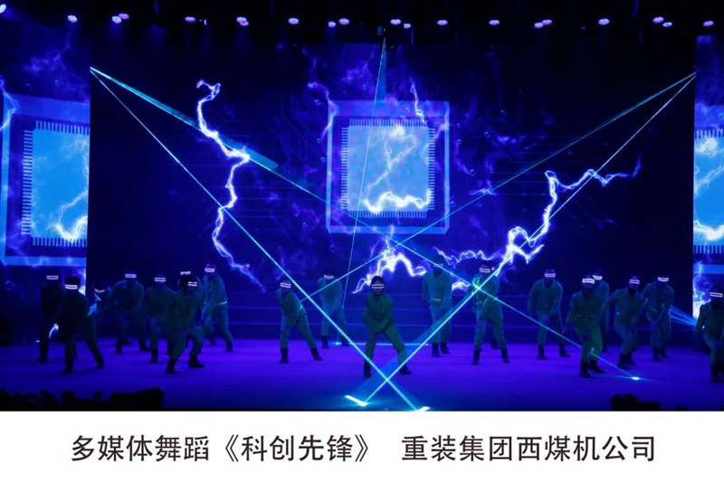 多媒體舞蹈《科創(chuàng)先鋒》,以現(xiàn)代舞和魔術表演相結合的藝術形式,生動展現(xiàn)了趙亦輝及其團隊探索、研發(fā)10米超大采高煤機裝備,將其推向世界的突破,頌揚科技工作者的創(chuàng)新精神與愛國情懷,展示科技創(chuàng)新的力量與魅力。