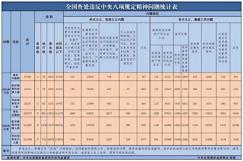 中央紀委國家監(jiān)委公布全國查處違反中央八項規(guī)定精神問題匯總情況。2024年,全國共查處違反中央八項規(guī)定精神問題225275起,其中,違規(guī)吃喝問題占2024年度查處問題總數的22.7%。