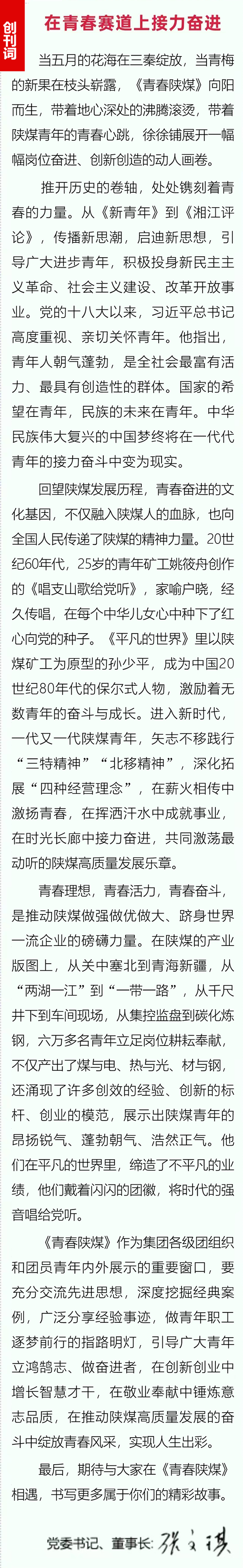 值此“五四”青年節(jié)到來之際,由陜煤集團團委主辦的以交流提升共青團和青年工作為主的實用性、探索性電子期刊《青春陜煤》正式發(fā)布。陜煤集團黨委書記、董事長張文琪發(fā)表了創(chuàng)刊詞,勉勵廣大團員青年積極作為、挺膺擔當,在青春賽道上接力奮進。