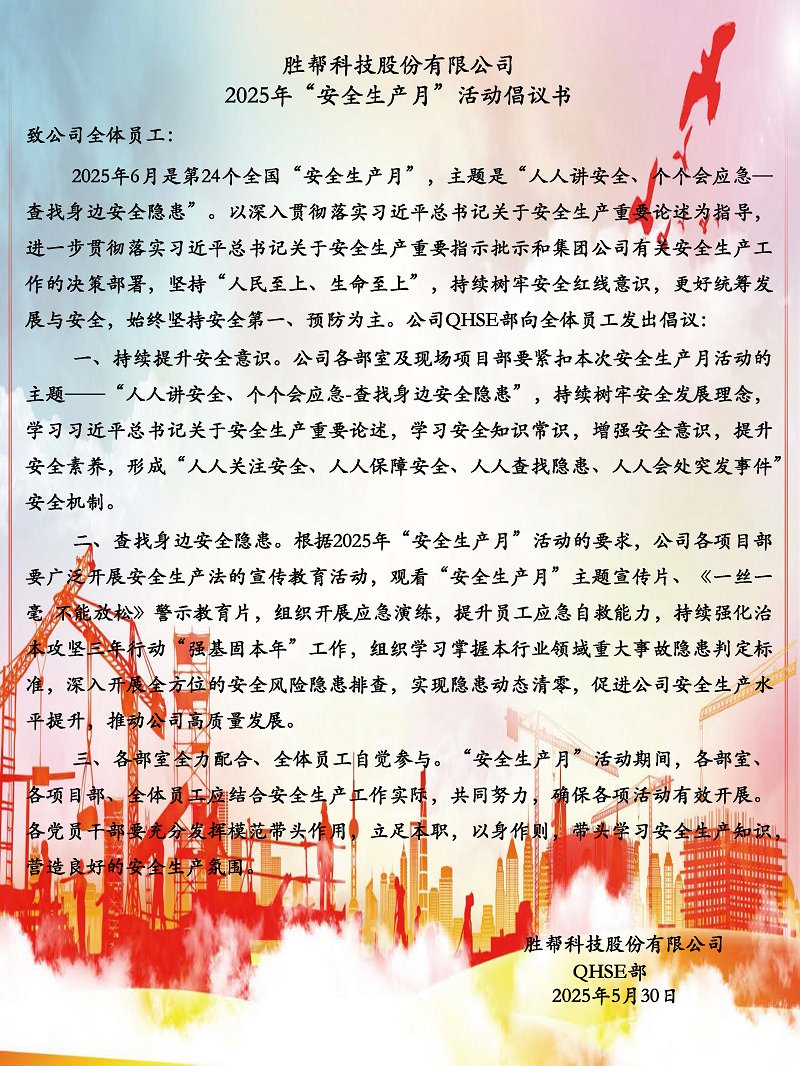 勝幫科技股份有限公司2025年“安全生產(chǎn)月”活動(dòng)倡議書