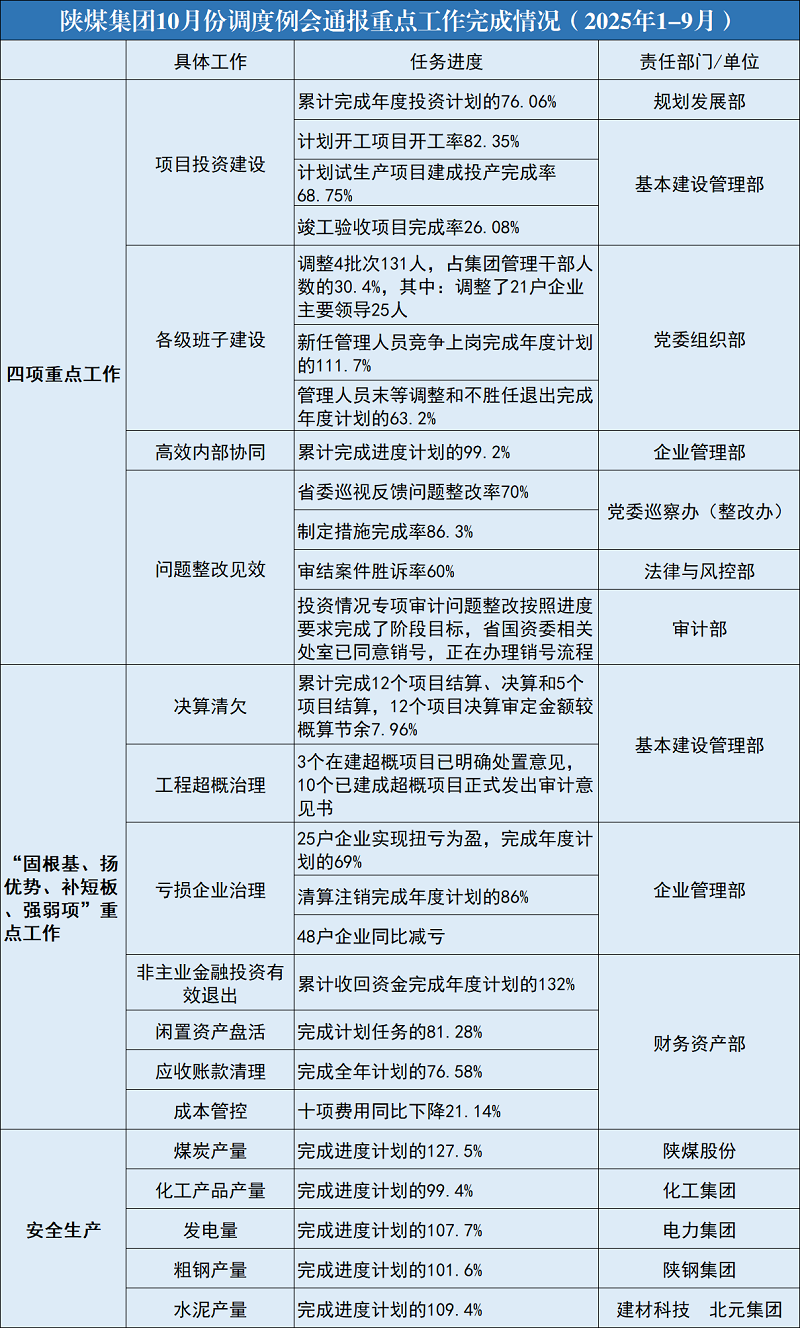 前三季度,集團(tuán)各項(xiàng)工作穩(wěn)中有進(jìn),主要經(jīng)營(yíng)指標(biāo)大幅優(yōu)于全行業(yè)平均水平,固根基、揚(yáng)優(yōu)勢(shì)、補(bǔ)短板、強(qiáng)弱項(xiàng)工作成效持續(xù)顯現(xiàn),切實(shí)以自身經(jīng)營(yíng)管理的確定性有效應(yīng)對(duì)了市場(chǎng)的不確定性。當(dāng)前正處在完成集團(tuán)公司全年任務(wù)目標(biāo)的沖刺階段,集團(tuán)上下必須堅(jiān)持目標(biāo)不變、任務(wù)不減、干勁不松的要求,主動(dòng)加壓、積極作為,緊抓市場(chǎng)價(jià)格回暖窗口期,提高煤炭、化工、鋼鐵、發(fā)電等主要產(chǎn)品實(shí)物量,推動(dòng)提產(chǎn)增銷,強(qiáng)化產(chǎn)銷協(xié)同,確保實(shí)現(xiàn)“十四五”圓滿收官、“十五五”良好開(kāi)局。