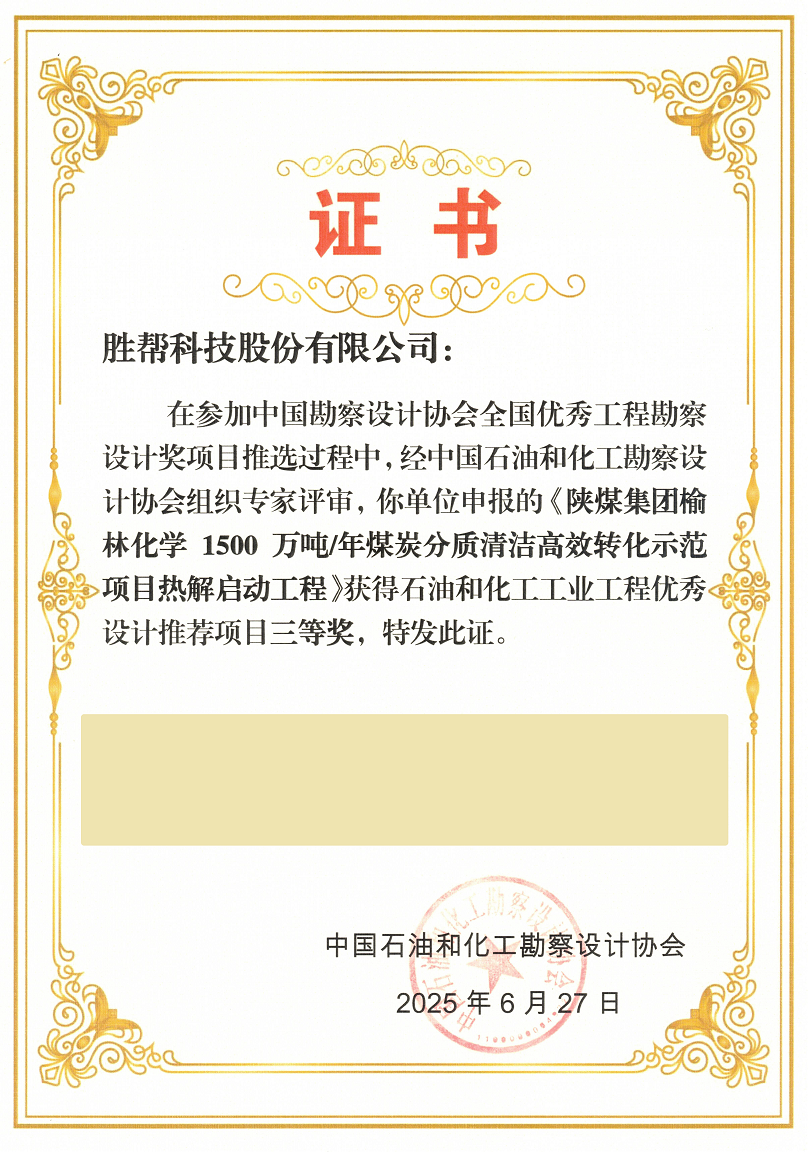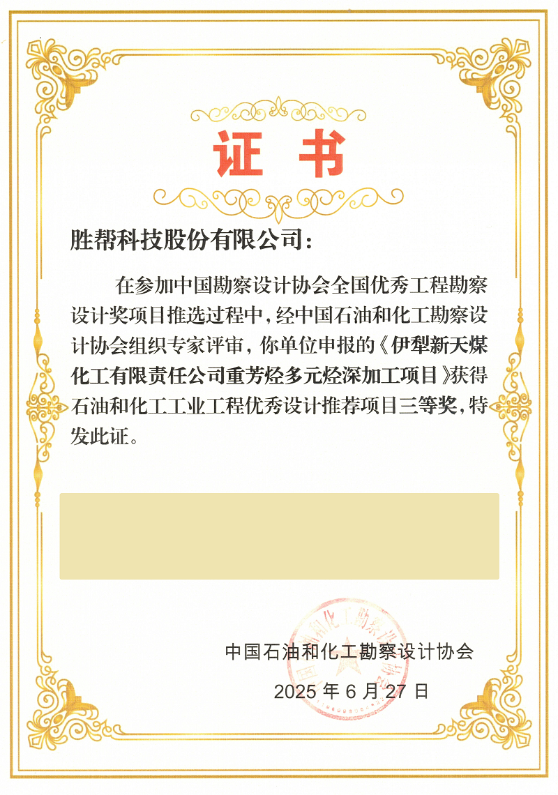 近期,在中國石油和化工勘察設(shè)計協(xié)會組織推薦“2025年度優(yōu)秀工程勘察設(shè)計行業(yè)獎”評選活動中,勝幫科技榮獲行業(yè)級優(yōu)秀工程設(shè)計三等獎。