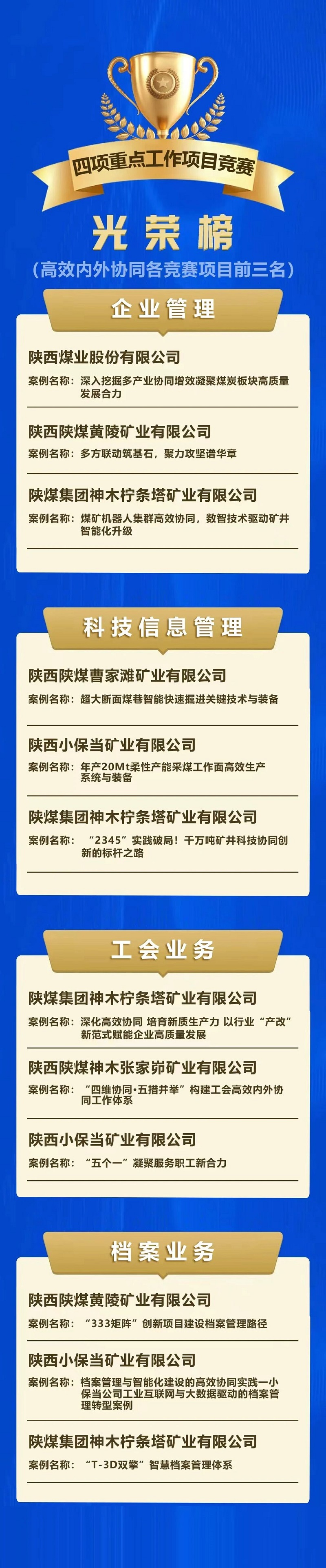 10月23日至24日,陜煤集團在曹家灘礦業(yè)公司舉辦高效內(nèi)外協(xié)同業(yè)務競賽。62支參賽隊伍在企業(yè)管理、科技信息管理、工會業(yè)務、檔案業(yè)務4個賽項中激烈角逐,最終評選出金銀銅獎和金牌案例主創(chuàng)。集團公司黨委委員、工會主席、職工董事李向東及賽項部門負責人分別為各賽項獲獎單位和個人頒獎。