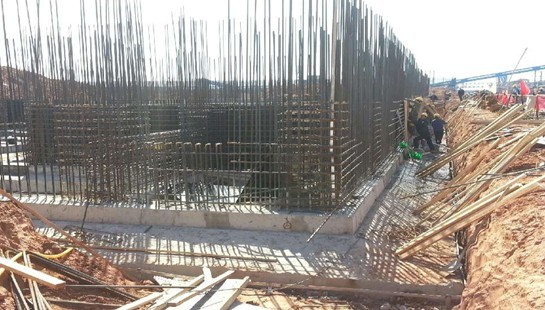 現(xiàn)場施工人員正在調(diào)整基礎(chǔ)梁的布筋