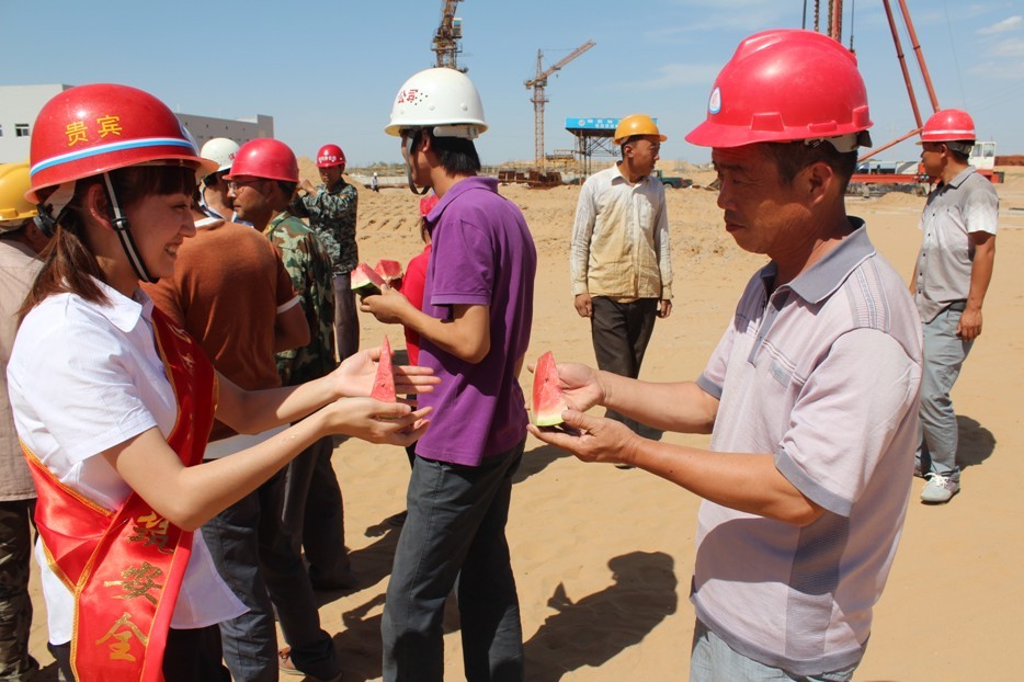 隨著夏季的來臨,氣溫的不斷升高,施工人員露天進行施工作業(yè),體能消耗很大,其防暑降溫工作成為了重中之重。為保障施工人員身體健康,保證安全生產(chǎn),我項目部連同業(yè)主單位特采取切實有效的防護措施,堅持以人為本,認真做好一線工人的防暑降溫工作。業(yè)主單位為每位員工和農(nóng)民工朋友免費派發(fā)毛巾、涼茶、西瓜等防暑物品,避免中暑現(xiàn)象的發(fā)生。我項目部在送清涼活動中,積極進行了防暑降溫知識的宣傳活動,并通過采取多種有力措施進行防暑降溫,適當調(diào)整施工作業(yè)時間,根據(jù)當?shù)貧鉁厍闆r,避開高溫時段,科學(xué)合理安排作息時間,切實保障施工人員在高溫天氣下的安全健康。
