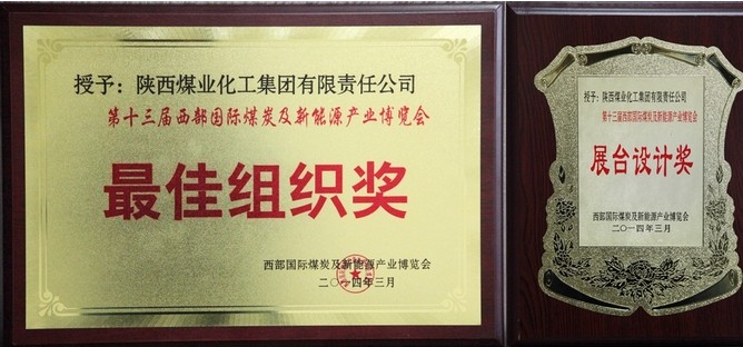 陜煤化集團(tuán)在此次博覽會(huì)上積極周密組織參展事宜,精心設(shè)計(jì)展臺布置,展臺氣勢恢宏彰顯了陜煤化自身企業(yè)文化特色,受到大會(huì)組委會(huì)的肯定和好評,最終獲得最佳組織獎(jiǎng)和展臺設(shè)計(jì)獎(jiǎng)兩個(gè)獎(jiǎng)項(xiàng)。