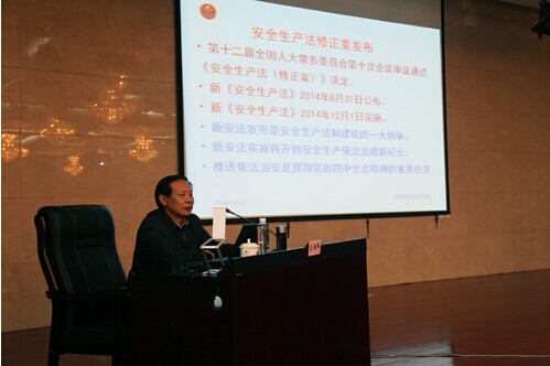 講座中,支同祥從新《安全生產(chǎn)法》修改背景、思路、原則、要求、經(jīng)過等五個方面進行講解,重點對新《安全生產(chǎn)法》的修法要點、涉及到的六個重點變化、十二個增加、十個完善、十個創(chuàng)新作了詳細的分析和說明。他指出,新《安全生產(chǎn)法》牢固樹立以人為本、生命至上的理念,堅守發(fā)展決不能以犧牲人的生命為代價這條“紅線”,建立生產(chǎn)經(jīng)營單位負責(zé)、職工參與、政府監(jiān)管、行業(yè)自律、社會監(jiān)督的機制,進一步明確了各方安全生產(chǎn)職責(zé)。對于建立健全“黨政同責(zé)、一崗雙責(zé)、齊抓共管”的安全生產(chǎn)責(zé)任體系,進一步提升安全生產(chǎn)工作的重要地位、強化生產(chǎn)經(jīng)營單位主體責(zé)任、加強政府監(jiān)管、強化責(zé)任追究,預(yù)防和減少生產(chǎn)安全事故,保障人民群眾生命和財產(chǎn)安全,促進經(jīng)濟社會持續(xù)健康發(fā)展具有重大意義。支同祥強調(diào),新《安全生產(chǎn)法》的頒布實施是安全生產(chǎn)的一件大事,學(xué)習(xí)實施新《安全生產(chǎn)法》是貫徹黨的四中全會精神的重要任務(wù)。今后對于新《安全生產(chǎn)法》的落實應(yīng)用,一要深入學(xué)習(xí)理解。企業(yè)各級領(lǐng)導(dǎo)帶頭學(xué),安全管理人員帶頭學(xué),帶動車間、班組、各類操作人員全面學(xué)習(xí),深入理解,做到知法、懂法、守法;二要大力宣傳貫徹。企業(yè)各級領(lǐng)導(dǎo)要高度重視,提高對新安全法宣傳貫徹重要性的認識,加大工作力度,廣泛宣傳,掀起新高潮,進一步營造安全法治氛圍;三要全面推進實施,各類企業(yè)要采取各種措施,推進新《安全生產(chǎn)法》的全面實施,強化企業(yè)主體責(zé)任,強化安全預(yù)防,增強安全保障能力,做到依法依規(guī)生產(chǎn),杜絕違法違規(guī),防范各類事故,推進企業(yè)安全生產(chǎn)形勢的持續(xù)穩(wěn)定好轉(zhuǎn)。