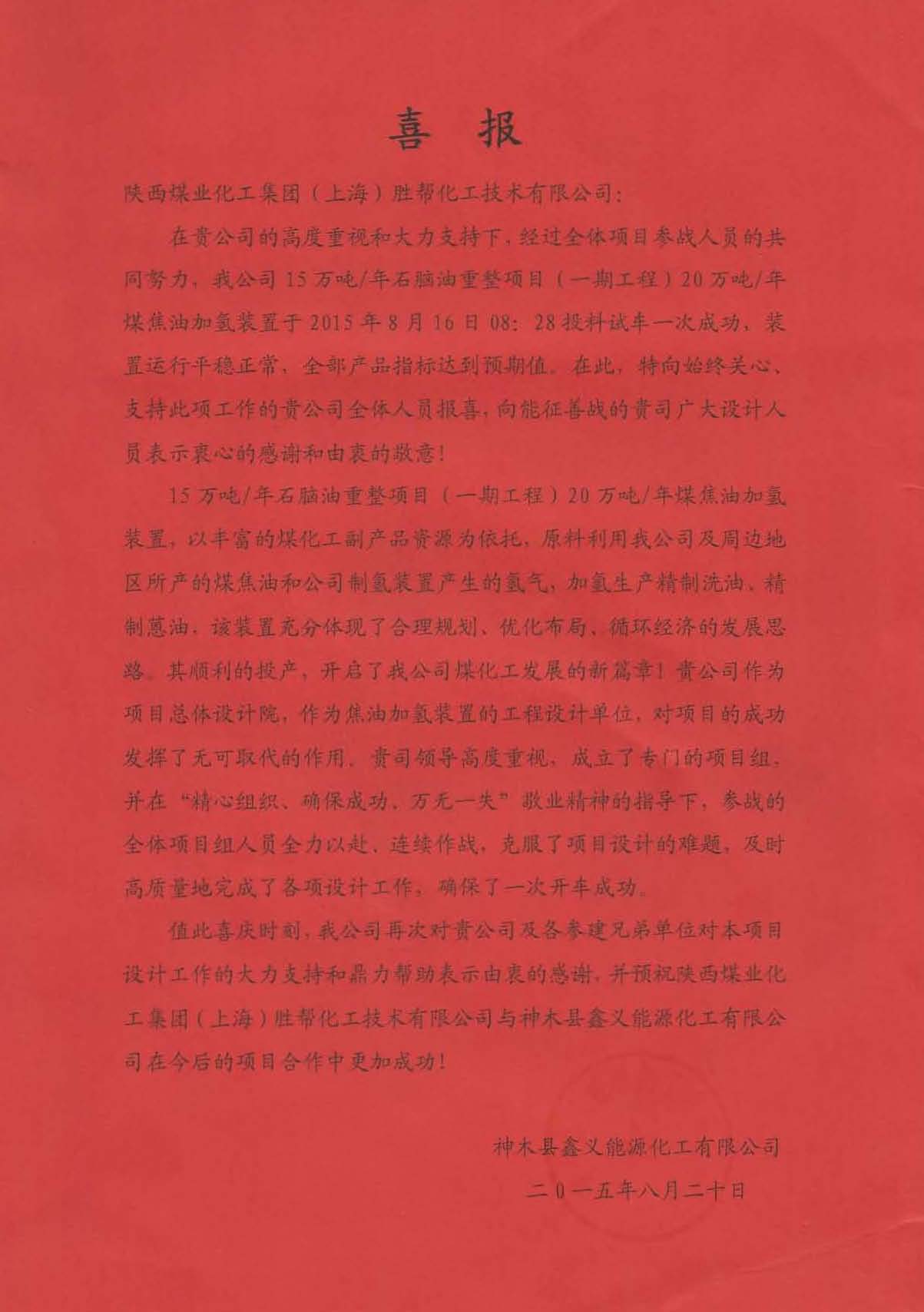 2015年8月,由陜西煤業(yè)化工集團(上海)勝幫化工技術(shù)有限公司承接的神木縣鑫義能源化工有限公司65萬噸/年煤焦油加氫綜合利用建設(shè)工程一期20萬噸/年煤焦油加氫裝置順利投產(chǎn),是繼黑龍江寶泰隆、內(nèi)蒙慶華之后,又一個投產(chǎn)項目。神木縣鑫義能源化工有限公司特向我公司發(fā)來喜報。